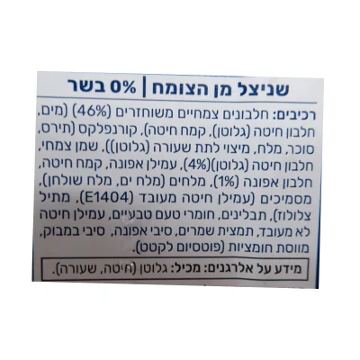 לפניכם ערך תזונתי של שניצל מן הצומח 0% בשר הקצב הכחול.